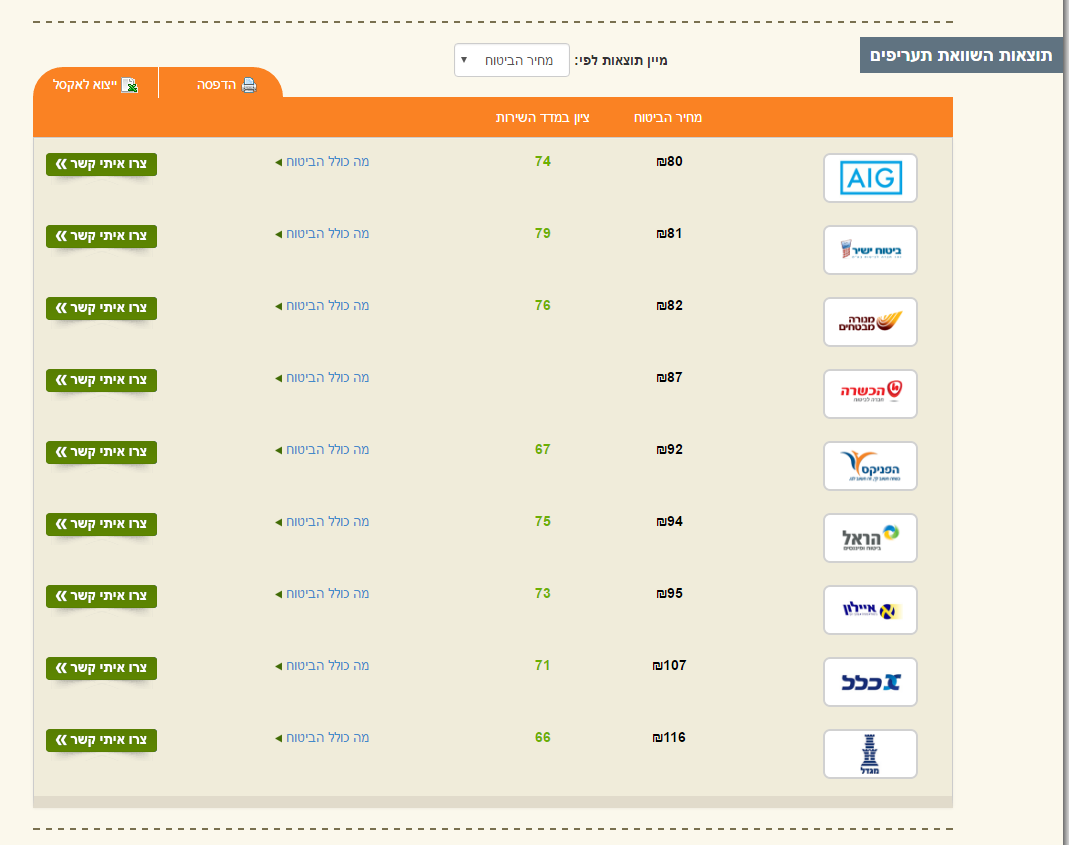 Теперь вы можете выбрать самую выгодную цену. И если ваш страховой агент работает только с компаниями Клаль и Мигдаль, вы может поменять страхового агента на того который работает с компаниями AIG и Битуах яшир, потому как на этом вы сможете сэкономить десятки шекелей в месяц.
