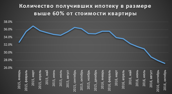 Еще одно изменение коснулось фильтрации клиентов банками. Если раньше банки давали деньги даже не очень кредито-способным клиентам, то теперь, клиенты с высоким риском не возврата, у которых низкий начальный капитал для покупки квартиры, снизился. В январе 2012-го года 32.7% получили ипотеку выше 60%-ти от стоимости квартиры. В феврале 2016 количество клиентов, получивших ипотеку с кредитом выше 60% от стоимости квартиры, повысился и составил уже 35.6%. А вот в октябре 2016, их количество значительно снизилось до 27.2%. Основываясь на опыте, мне кажется, что банки начали фильтровать клиентов с низким начальным капиталом для покупки квартиры.